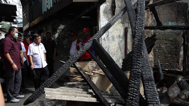 Jakarta - Ketua Umum PMI Jusuf Kalla meninjau lokasi pengungsian korban kebakaran di Jalan Kebon Kosong, Kemayoran, Jakarta Pusat, Rabu (11/12). Begini momennya.