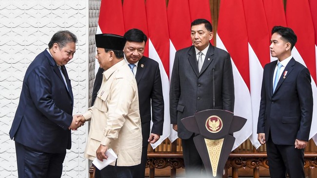 Presiden Prabowo Subianto (kedua kiri) berjabat tangan dengan Menteri Koordinator Bidang Perekonomian Airlangga Hartarto (kiri) disaksikan Wakil Presiden Gibran Rakabuming Raka (kanan), Menko Polkam Budi Gunawan (ketiga kiri), dan Menteri Pertahanan Sjafrie Sjamsoeddin (kedua kanani) usai menyampaikan keterangan kepada media sebelum melakukan kunjungan ke luar negeri di Pangkalan TNI AU Halim Perdanakusama, Jakarta, Selasa (17/12/2024).