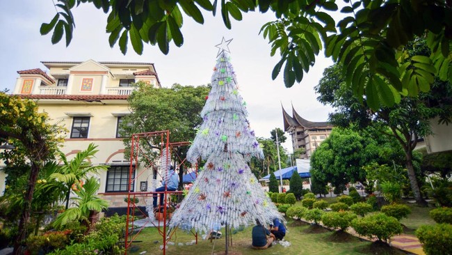 Padang - Pohon Natal tidak hanya terbuat dari cemara. Di Gereja Katedral ST Theresia Padang, pohon Natal terbuat dari botol plastik bekas.