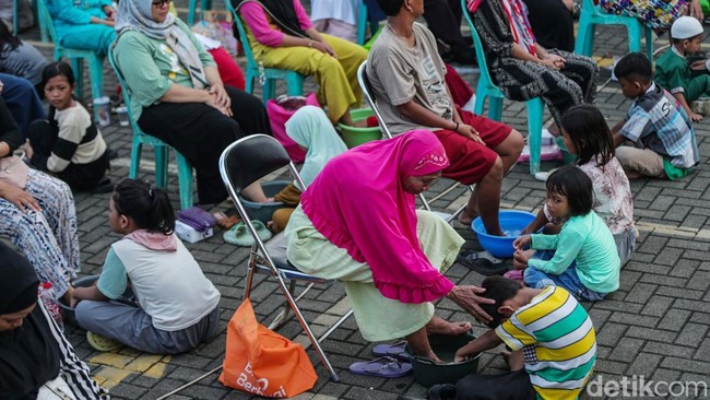 Jakarta - Sejumlah anak membasuh kaki ibunya di kawasan Duri Pulo, Jakarta, Minggu (22/12/2024). Tangis pecah baik dari ibu maupun anak saat prosesi basuh kaki.