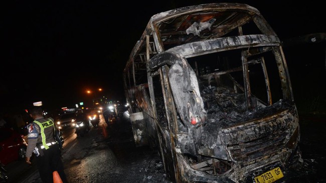 Klaten - Sebuah bus yang mengangkut rombongan wisata terbakar di Jalan Solo-Yogyakarta, Delanggu, Klaten, Jawa Tengah. Begini kondisinya.