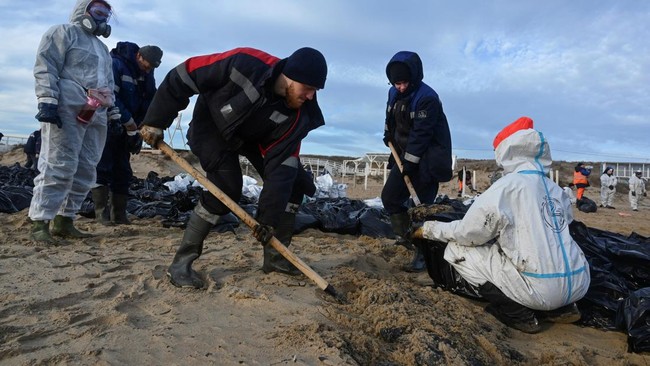 Berjibaku Bersihkan Tumpahan Minyak di Garis Pantai Rusia
