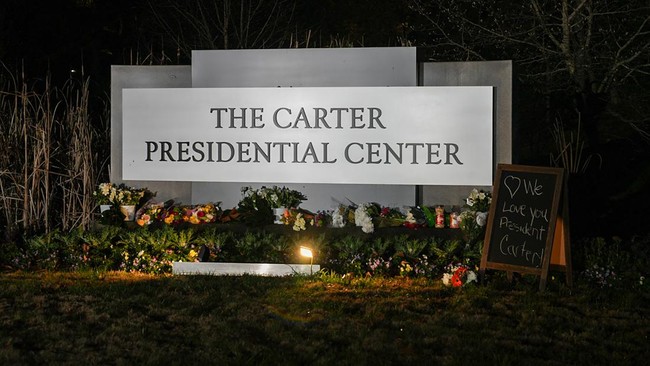 Sebuah tugu peringatan didirikan di The Carter Presidential Center setelah kematian Presiden Jimmy Carter di Atlanta, Georgia, Amerika Serikat, Minggu (29/12/2024). (Megan Varner/Getty Images)