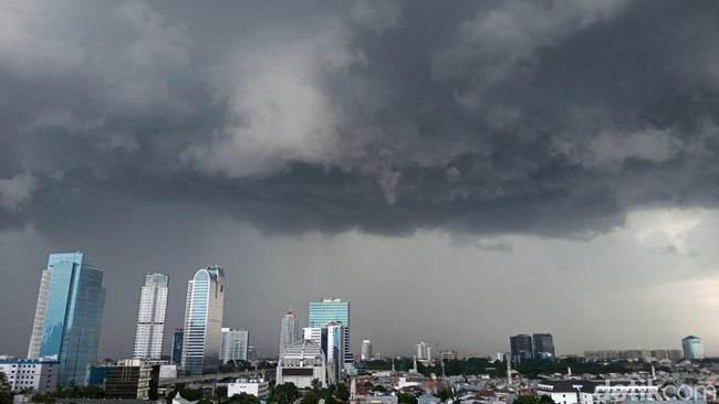 Jakarta - Mendung hitam menggelayut di langit Jakarta, Minggu (5/1/2025). Bahkan mendung telah menyebabkan hujan di sebagian wilayah Jakarta.