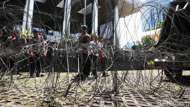 Jakarta - Kawat berduri dipasang di depan gedung KPK, Jl Kuningan Persada, Jakarta. Pagar tersebut untuk antisipasi aksi demonstran yang kerap kali naik ke taman.