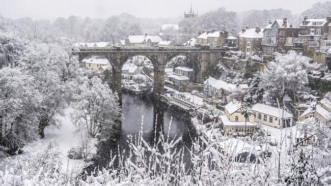 Salju menutupi rumah-rumah dan 'Jembatan Knaresborough' di Knaresborough, Inggris, pada Minggu (5/1). AP/Danny Lawson