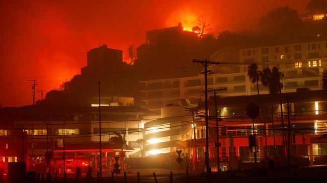 California - Langit kawasan elite Pacific Palisades di California berubah menjadi merah karena kebakaran hutan saat malam tiba. Begini penampakannya.
