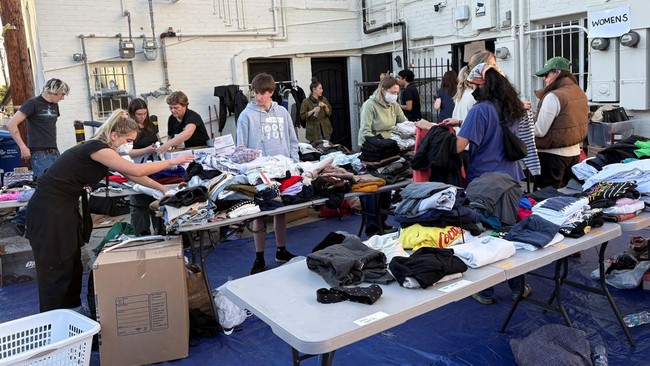 Pusat donasi luar ruangan yang besar membagikan makanan, pakaian, dan perlengkapan kebersihan kepada orang-orang yang terkena dampak kebakaran hutan Los Angeles pada Jumat (10/1/2025). REUTERS/Lisa Richwine