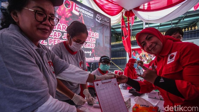 Jakarta - Para kader dan simpatisan DPC PDIP menggelar aksi cap jempol berdarah. Aksi itu untuk memperingati HUT ke-52 PDIP dan dukungan kepada Sekjen Hasto Kristiyanto.