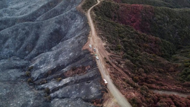 Sebuah jalan menjadi pemisah kebakaran hutan di Los Angeles. Tampak hutan di sisi kiri jalan telah hangus terbakar. Sementara hutan yang berada di sisi kanan masih terlihat hijau.