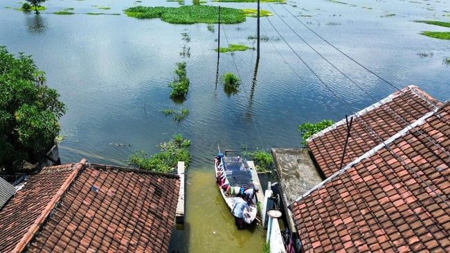 Pasuruan - Banjir akibat hujan dengan intensitas cukup tinggi beberapa hari terakhir merendam sekitar 2.350 rumah di Pasuruan, Jawa Timur. Begini potretnya dari udara.