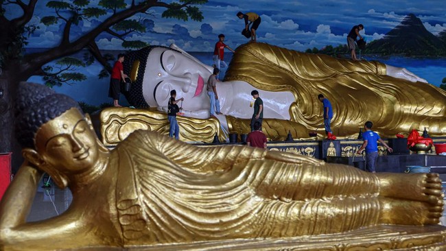 Prosesi Pencucian Patung Buddha Tidur di Vihara Bogor Jelang Imlek