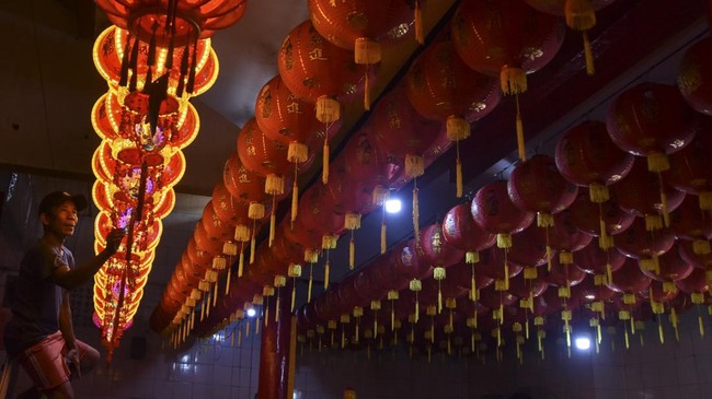 Pengurus klenteng memasang lampion di Klenteng Hok Tek Bio, Kampung Kerukunan, Ciamis, Jawa Barat, Kamis (20/1/2025).
