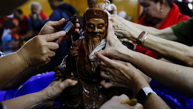 Para penyembah membersihkan patung suci saat mereka mempersiapkan perayaan Tahun Baru Imlek, di Kuil Amurva Bhumi, Jakarta, Rabu (22/1/2025). (REUTERS/Willy Kurniawan)