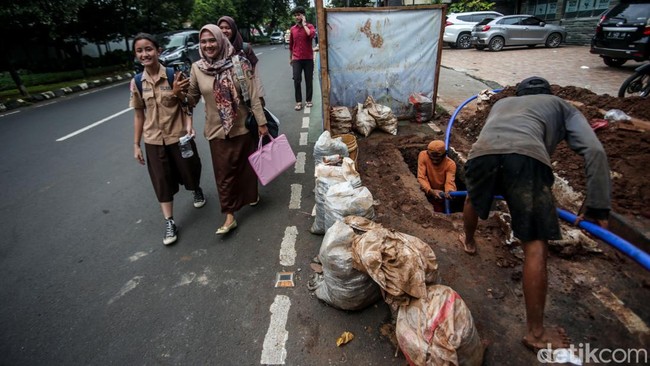 Jakarta - Pengerjaan kabel fiber optik sedang dilakukan di Jalan KH Abdullah Syafei, Jakarta. Pengendara dan pejalan kaki harap berhati-hati saat melintas.