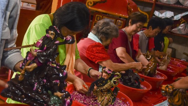 Ciamis - Warga Tionghoa memandikan patung dewa di Klenteng Hok Tek Bio, Kabupaten Ciamis. Tradisi itu sebagai simbol penyucian diri sekaligus memohon keberkahan.