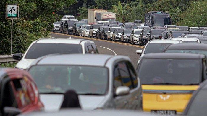 Kepadatan kendaraan di jalur wisata menuju Puncak, Ciawi, Kabupaten Bogor, Jawa Barat, Senin (28/1/2025).Β