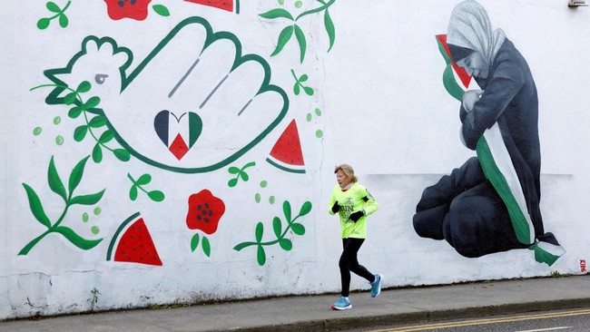 Dublin - Semuah mural bentuk dukungan untuk warga Gaza terlukis di sebuah tembok di jalanan Kota Dublin, Irlandia. Mural tersebut karya Emmalene Blake.