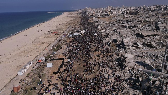 Gaza - Ratusan ribu warga Palestina yang mengungsi akhirnya kembali pulang ke rumah. Meski hancur, pulang ke rumah menjadi penantian 15 bulan yang berat warga Gaza.