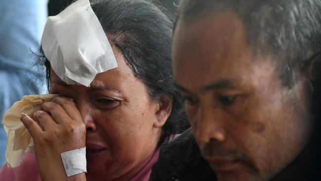 Korban luka-luka Sugiarti (kiri) menangis saat memberikan data suaminya yang meninggal dunia dalam kecelakaan di Gerbang Tol Ciawi 2 Bogor di Pos Ante Mortem DVI Polda Jabar, RSUD Ciawi, Bogor, Jawa Barat, Rabu (5/2/2025).