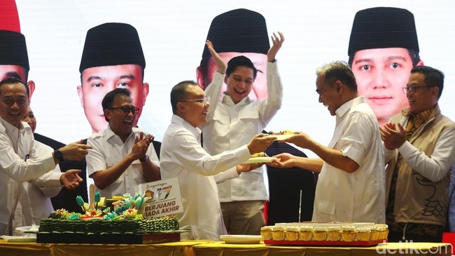 Sekjen Gerindra Ahmad Muzani dan Ketua Harian Gerindra Sufmi Dasco Ahmad memotong nasi tumpeng kemudian dibagikan kepada para kader.