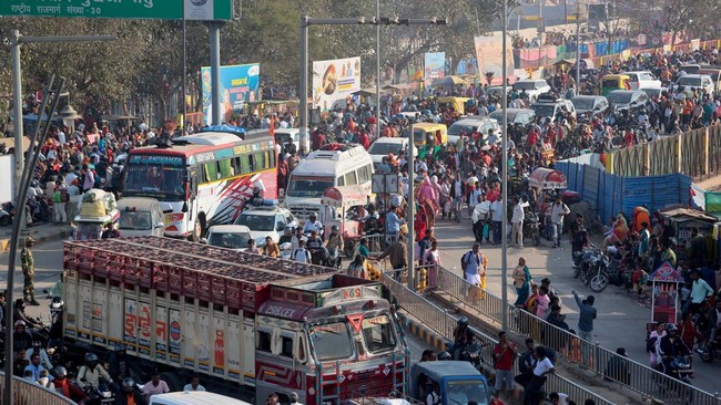 Kendaraan terjebak dalam kemacetan lalu lintas saat umat meninggalkan Sangam, pertemuan sungai Gangga dan Yamuna dengan sungai Saraswati yang mistis dan tak terlihat, selama "Maha Kumbh Mela", atau Festival Kendi Besar, di Prayagraj, India.