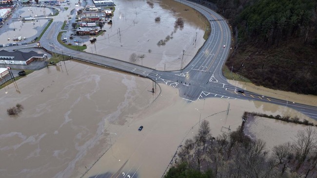 Kentucky - Foto udara menunjukkan sungai meluap di lokasi banjir mematikan di Kentucky. Media lokal melaporkan sedikitnya 11 orang tewas akibat banjir.