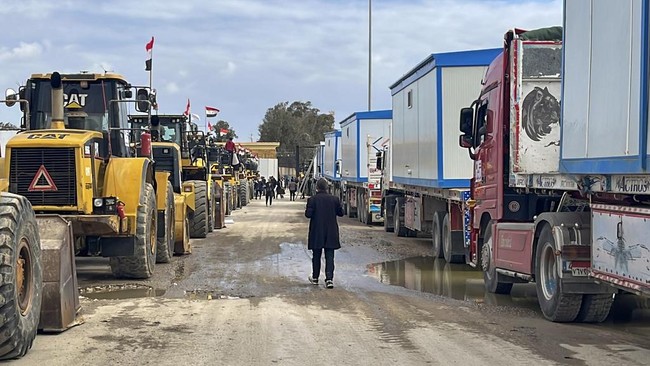 Buldoser dan truk pengangkut rumah semipermanen menunggu untuk memasuki Gaza di perbatasan Rafah antara Mesir dan Jalur Gaza, Selasa (18/2/2025). (AP Photo/Mohamed Arafat)