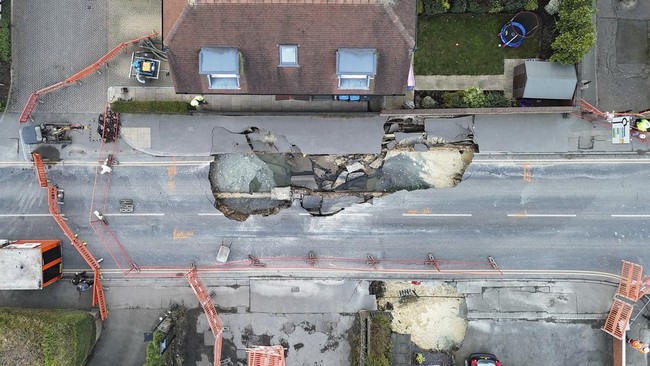 Inggris - Lubang ambles atau sinkhole besar muncul di jalanan Desa Godstone, Inggris. Lubang itu terus meluas sampai 20 meter.