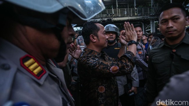 Jakarta - Mensesneg Prasetyo Hadi turun menemui massa aksi 'Indonesia Gelap' di kawasan Patung Kuda, Jakarta, sore ini. Prasetyo turun di tengah desakan massa.