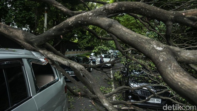 Jakarta - Sebuah pohon tumbang di Menteng, Jakarta Pusat, Rabu (26/2/2025). Tiga unit mobil yang tengah menunggu lampu merah tertimpa dan ringsek.