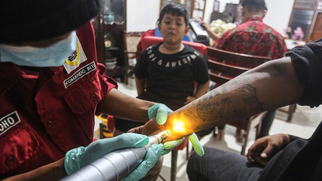 Semarang - Program layanan hapus tato gratis digelar di Markas Sasana Tinju Rambing, Semarang, Jawa Tengah, Kamis (27/2/2025). Begini suasananya.