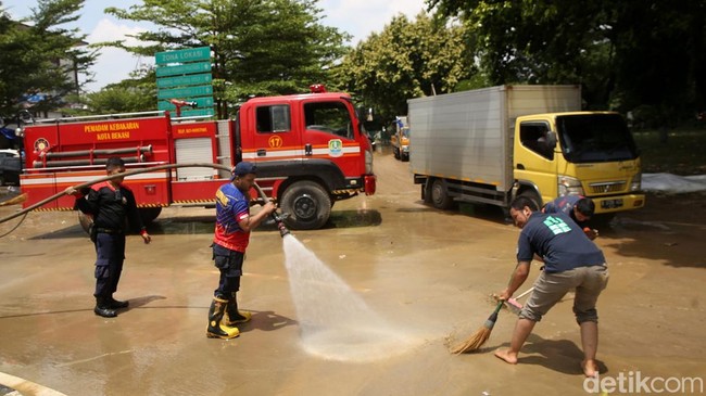 Bekasi - Banjir yang melanda di Perumahan Kemang Pratama berangsur surut, Rabu (5/3/2025) pagi. Warga dibantu petugas damkar mulai membersihkan lumpur sisa banjir.