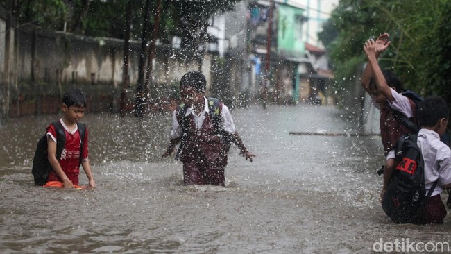 Anak-anak melewati banjir di Jl Kemuning III, Pamulang, Tangsel, Senin (10/3/2025). Jalanan banjir akibat hujan deras yang mengguyur.