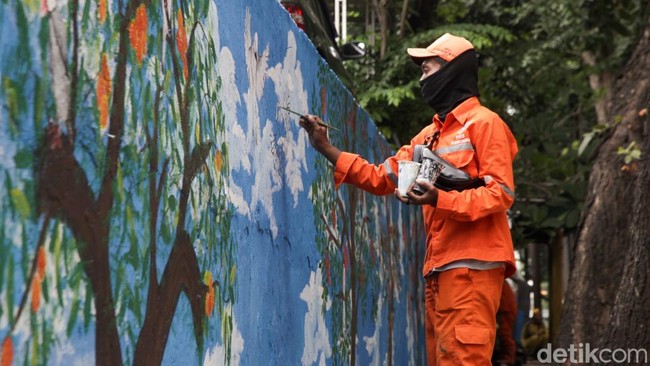Petugas Penanganan Prasarana dan Sarana Umum (PPSU) Kelurahan Kebayoran Lama Selatan melukis mural di pedestrian Arteri Pondok Indah, Jakarta Selatan, Kamis (13/3/2025).