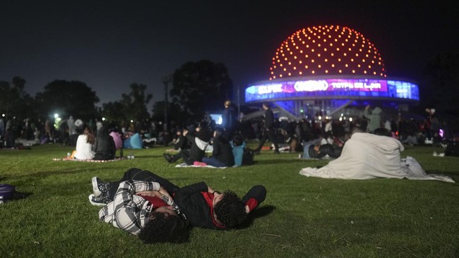 Orang-orang berbaring di rumput di luar planetarium saat menyaksikan gerhana bulan total di Buenos Aires, Argentina, Jumat (14/3/2025).