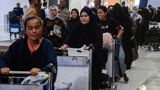 Tangerang - Sebanyak 193 pekerja migran Indonesia (PMI) ilegal yang dideportasi Arab Sauditiba di Tanah Air melalui Bandara Internasional Soekarno-Hatta.Ini fotonya.