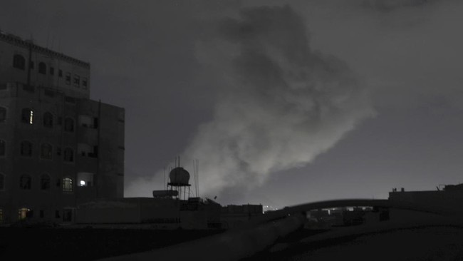 Asap mengepul dari lokasi yang dilaporkan terkena serangan udara AS di Sanaa, Yaman, Sabtu (15/3/2025). (AP Photo/Osamah Abdulrahman)