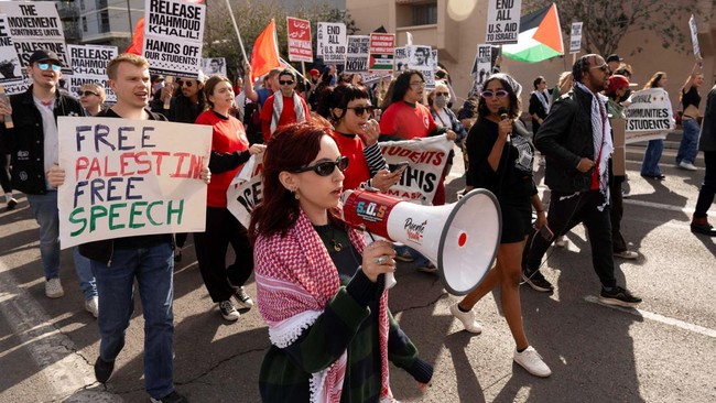 Para pengunjuk rasa berpawai menentang penahanan aktivis Palestina dan mahasiswa pascasarjana Universitas Columbia Mahmoud Khalil oleh ICE, selama protes di dekat Universitas Negeri Arizona (ASU) di Phoenix, Arizona, AS, 15 Maret 2025. REUTERS/Rebecca Noble.