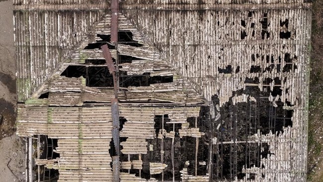 Foto udara menunjukkan atap yang rusak di sebuah klub malam di kota Kocani, Makedonia Utara, Minggu (16/3/2025). AP Photo/Armin Durgut