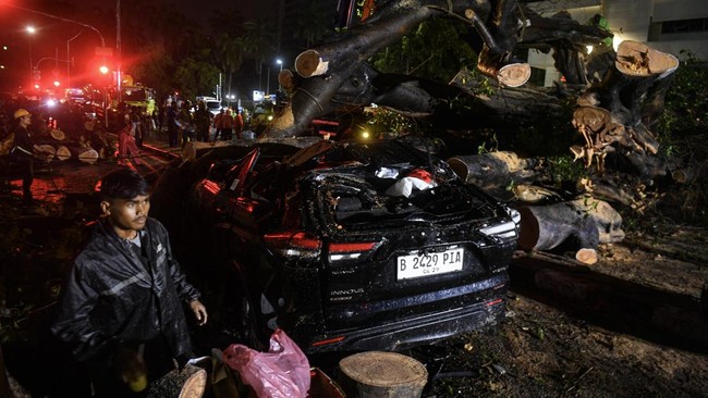 Jakarta - Pohon tumbang menimpang dua mobil di Kebon Sirih, Jakara Pusat, Selasa (18/3/2025) dini hari. Begini potretnya.