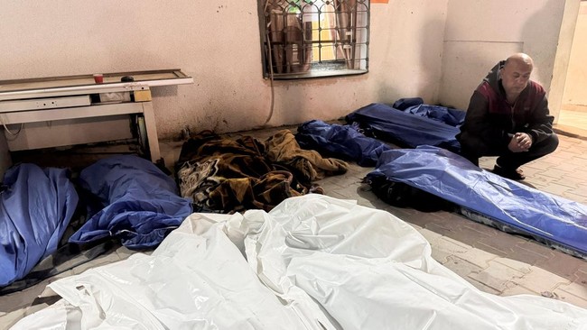 Seorang pelayat berjongkok di dekat jenazah warga Palestina yang tewas dalam serangan Israel, di sebuah rumah sakit di Kota Gaza pada 18 Maret 2025.