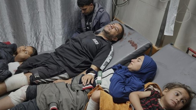 Warga Palestina yang terluka menunggu perawatan di rumah sakit setelah serangan udara tentara Israel di Khan Younis, Jalur Gaza selatan, Selasa (18/3/2025). (AP Photo/Mohammad Jahjouh)