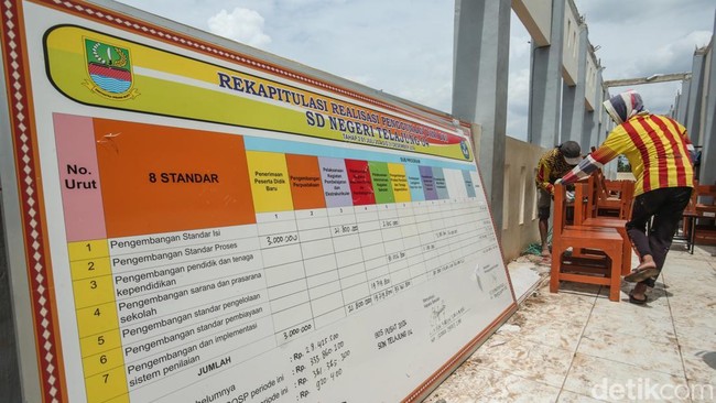 Petugas menurunkan kursi dari lantai dua di Sekolah Dasar Negeri (SDN) Telajung 04, Cikarang Barat, Selasa (18/3/2025).