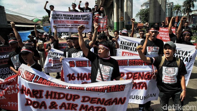 Jakarta - Massa aksi Asosiasi Pengusaha Truk Indonesia (Aptrindo) mogok operasi berunjuk rasa di Jalan Yos Sudarso Tanjung Priok, Jakarta Utara, Kamis (20/3/2025).