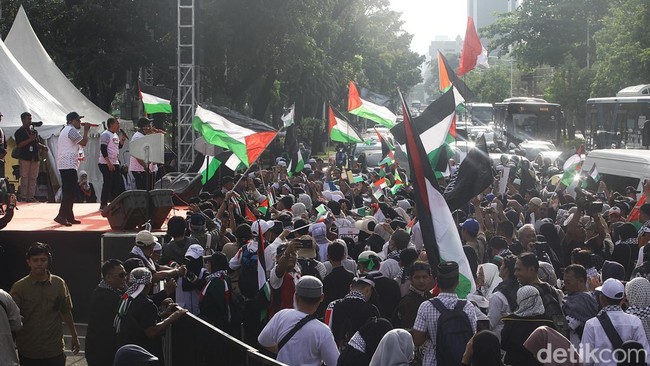 Jakarta - Massa Aliansi Rakyat Indonesia Bela Palestina menggelar aksi di depan Kedutaan Besar Amerika Serikat, Jakarta. Massa mengutuk keras serangan terbaru Israel.