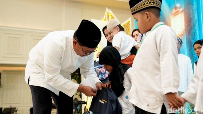 Direktur Utama Bank Mandiri Darmawan Junaidi saat menyerahkan santunan kepada anak yatim dan yayasan di Menara Mandiri, Jakarta, Senin (24/10/2025).