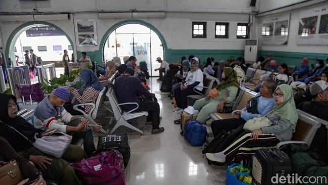 Jakarta - Gelombang mudik masih terasa di Stasiun Pasar Senen, Jakarta. Stasiun dipadati pemudik pada H-3 Idul Fitri 1446 Hijriah.