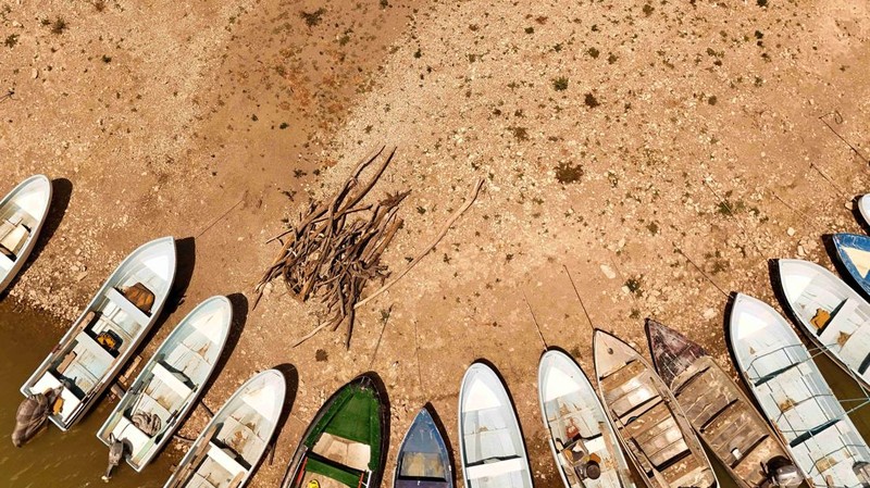Pemandangan dari drone menunjukkan perahu-perahu di bendungan La Boquilla yang airnya mengering, 5 April 2025.