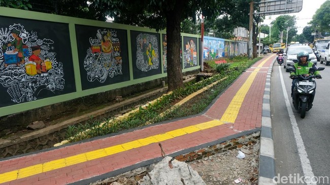 Jakarta - Trotoar di Pondok Pinang, Jaksel, tampil lebih semarak dengan mural. Langkah ini dilakukan untuk percantik area pedestrian sekaligus menghadirkan nuansa seni.